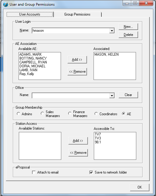 Rep Association - Available Reps – this list is derived from Traffic. To give the chosen user access to specific Reps, select them and move them to the Associated Reps box (double click or highlight them and click on the Add button)
