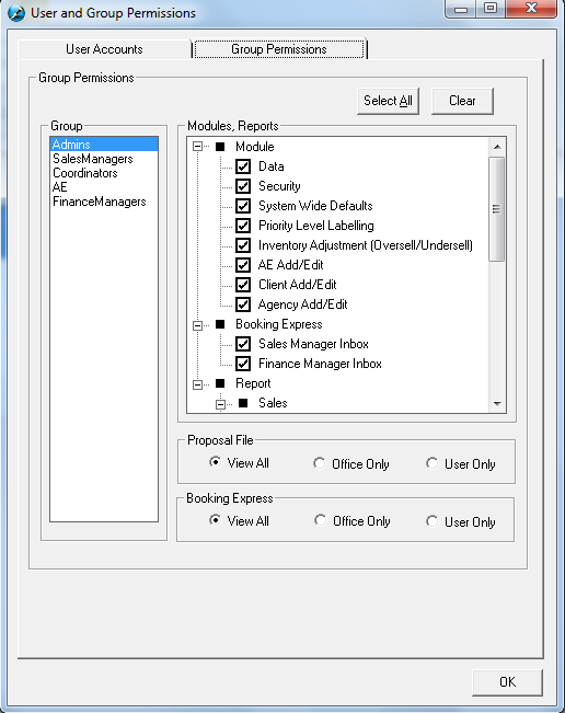 Access to the Proposal File/Booking Express – there are three options – View All, Office Only, and User Only. This pertains to the access level of each of the Groups (Admins, Sales Managers, Coordinators,Account Executives, and Finance Managers) and will affect all of the users who are set up as this type of user’s profile.