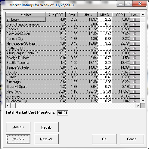 In this screen, it is possible to allocate a specific costs to a market that is available to you (based on the markets your stations measure against). To find this screen, go to the Markets menu within Schedule Builder, and choose Select Markets & Allocate Costs. The flight should be entered into the system first before making any changes. Once programs have been selected, the audience and ratings values appear on the screen. The Market % can be changed on a weekly basis (changing from week to week by clicking the Prev Wk or the Next Wk button)