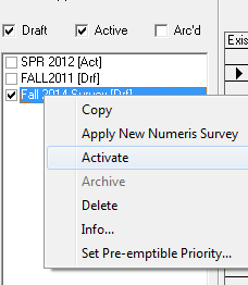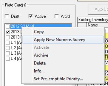 You will then see a list of active rate cards on the left. Checkmark the corresponding box and right click. Then select Apply New Numeris Survey.