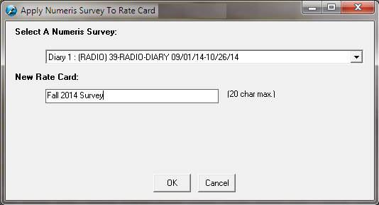 The latest Numeris Survey can be applied to an existing rate card. This will create a copy of the rate card selected and allow users to use the new Survey once activated.