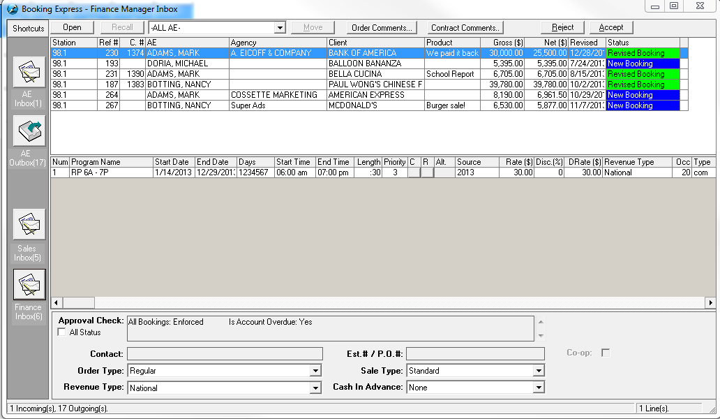 From the Booking Express, Sales and Finance Managers will be the only ones to view their respective Inbox. Each manager will need to check Booking Express frequently to approve or reject bookings so they may be sent to Traffic. There aren’t any alerts available in SDS to let the Managers know that they have pending orders to look after, so it is their responsibility. If they are rejected, Sales must then make the necessary adjustments and click on the Handshake button again to send it through the process again. Also, Sales Managers have the ability to change the Revenue Type and the Order Type on the booking before accepting or rejecting it.