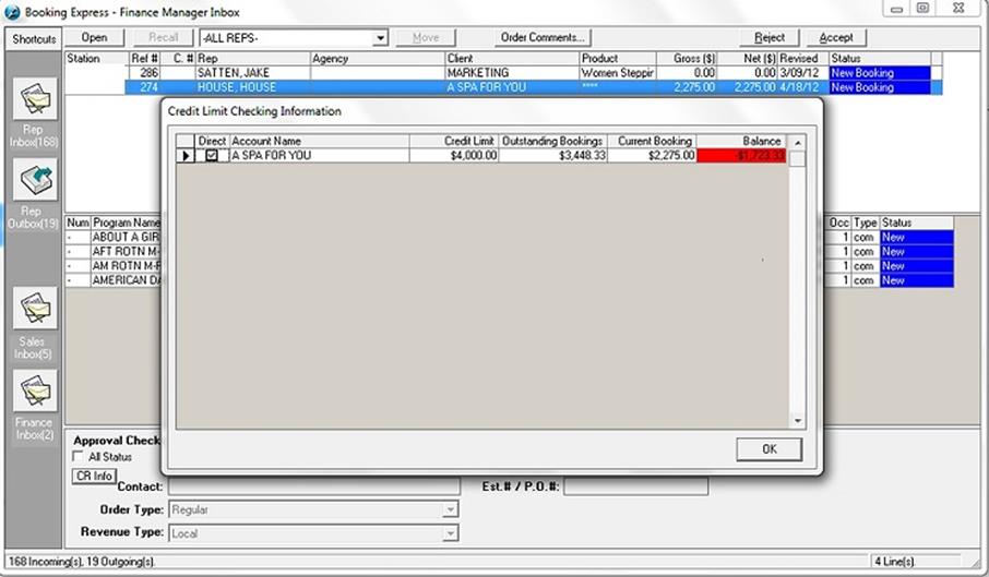 After clicking this button, the following screen will appear. This will give specific detail on what the credit limit is, what the outsanding bookings are, what the current booking is worth, and what the balance is. Since the currect booking exceeds the allowable $4000 credit limit, the order could be rejected by the Finance Manager (note that only the Finance Manager will see the ‘CR Info’ button)