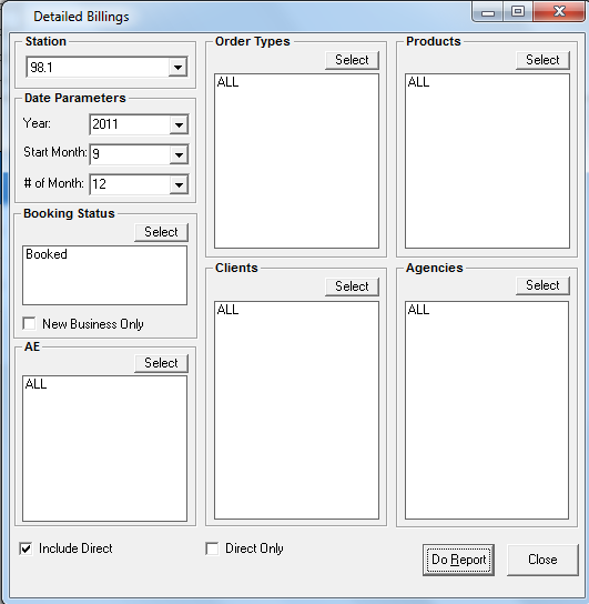 The detailed billing report provides management with a report that keeps track on billings for new orders (i.e., bookings) created during the time specified. The detailed billing report provides external offices with a means of determining what exactly has been booked during a specified time period. Values displayed are net of agency.