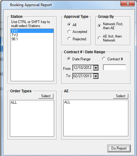 The Booking Approval Report will indicate to users who have access, who approved or rejected an order, and when it took place. From the report screen, choose all options required. The report can be filtered based on all orders, the ones that were accepted or ones that were rejected. Choose the date range or a specific contract number. Once all options are chosen, click on Do Report.