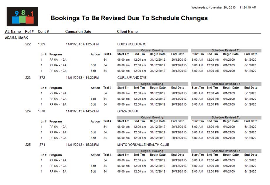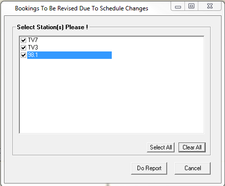 The Bookings to be Revised Report provides a list of all the bookings that are affected by the changes to the audience source(s). This report can be found under the Reports menu in the Commercial Inventory Control screen.