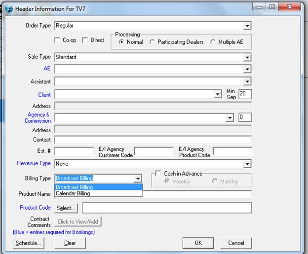 The Billing Type, the Agency Commission and the Time Separation can be changed. They are all accessible in the Header Information.