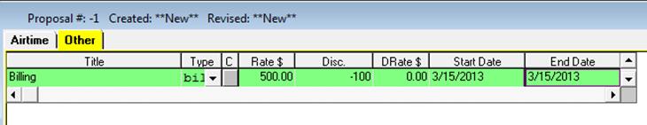 Enter in a billing line as you normally would. In the “Rate$” column enter in a value (this amount will not appear on the contract or the invoice). In the Disc. column, enter in -100. This will give a discount of 100%, making the “DRate$” column $0