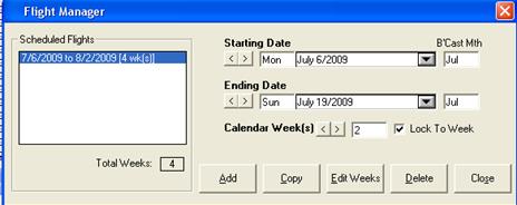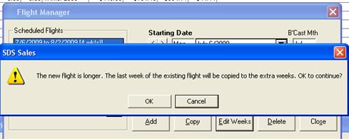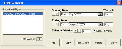 Click on the Edit Weeks button. The following message will appear. Click on Ok to continue. Then click the Close button on the Flight Manager