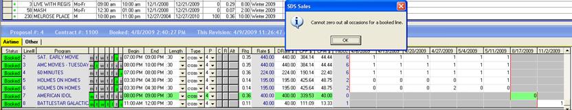 You will not be able to delete spots in the current week or if the line has started – the following message will appear. In this case, you will have to get the Traffic Department to remove the spots for you.