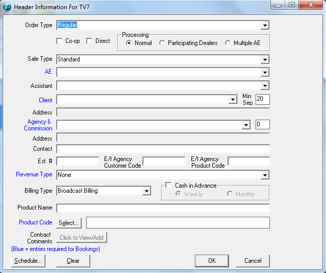 Commission (%) Agency - the agency commission will default based on the agency selected from the pick list, however this value can be changed by entering in the desired value (no decimals);