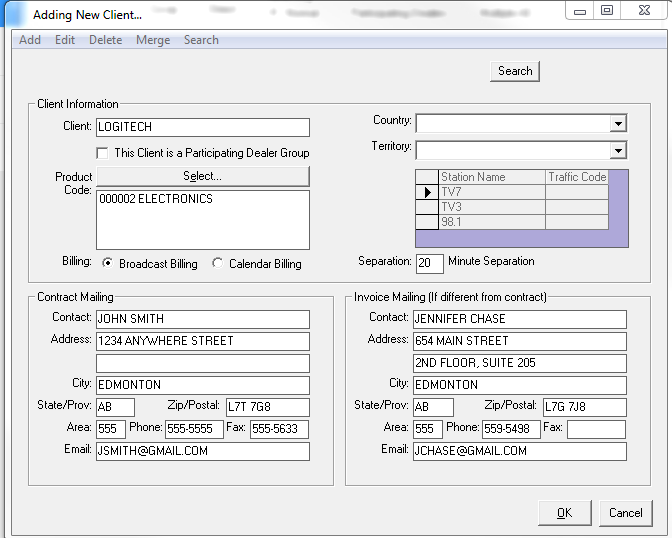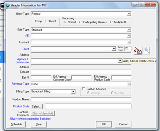 You will notice for certain fields such as Agency and Client, each time these fields are selected a button on the right side will follow. The Add, Edit or Delete button allows you to manage the Agency or Client. When adding new clients or agencies, ensure that it does not exist in the system already, as sometimes there may be variations to the way the name is spelled or abbreviated. It is important not to have duplicate entries, as Management Reports will become inaccurate.