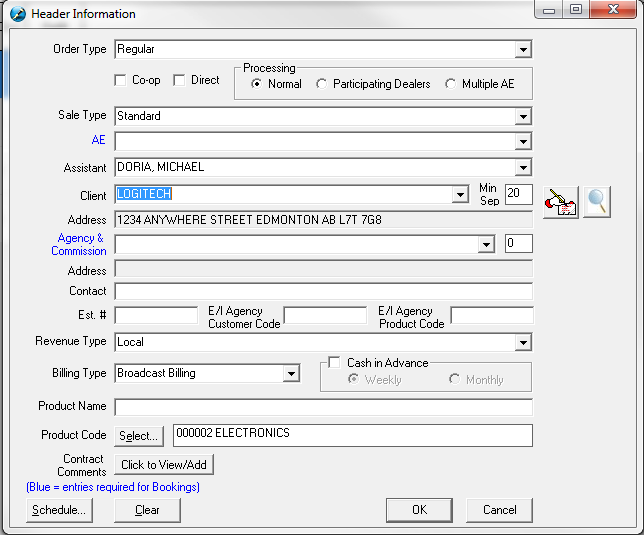 Advertiser –choose who the client is from the drop down. If the advertiser is direct, then the address of the advertiser will appear in the field below. If the advertiser is being billed to an agency, this field should be empty