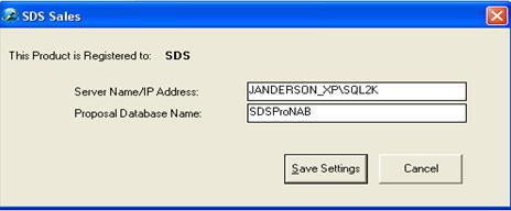 The database is now known as SDS Sales. Enter in the SQL Server Computer Name or IP Address, along with the SDS Sales Database Name in the appropriate fields and select [Save Settings].