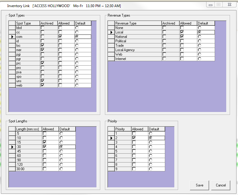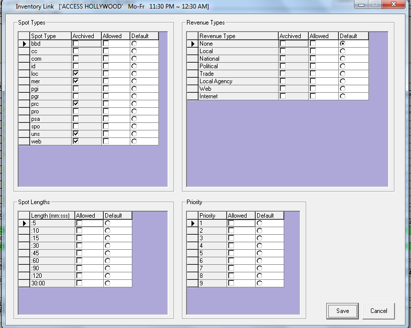 The following screen will appear. Under each of the sections, place a check mark under the ‘Allowed’ column. This will denote to users what the defaults will be for this program when it is selected while building an order in the Schedule Builder. The system will check and display the avails based on the default length and priority in Schedule Builder for each item (the default length and priority will change for each item selected)