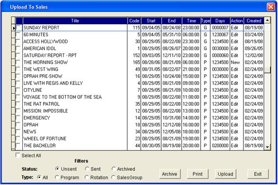 To upload the information into Sales, you must first select the program(s) you wish to attach to the audience table(s) by clicking to the left of the item in the New Inventory list. (as pictured below)