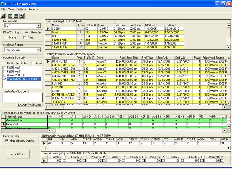 The Upload View displays New Inventory in the upper window that has been sent from Traffic. First, select the intended Station (drop-down list at the top left of screen). Then, select the Audience Format (drop-down list at the left of the screen).