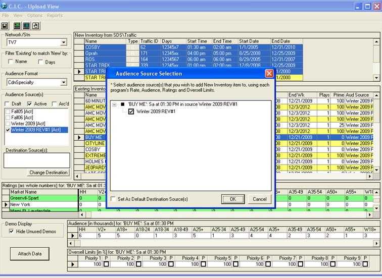 Second, you must select a program from the Existing Inventory list that you will use as a template (as picture above). The programs selected from the top list, will copy the Rates, Audience, Ratings and Oversell limits from the inventory item in the bottom list.