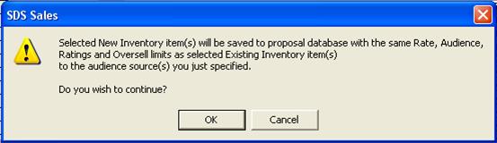 This pop-up advises that the ‘Selected New Inventory Item(s) will be saved to the Proposal database with the same Rate, Audience, Ratings and Oversell limits as the selected Existing Inventory item(s) to the specified audience source’.