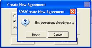 If creating a New Agreement Number and a number that already exists in the system is entered, the following message will appear. Click on Retry or Cancel