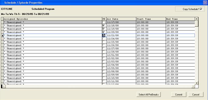 Next, place a checkmark in the “PB” box. In the example below there are multiple episodes for Cityline. In this case, pre-breaks can be assigned to every episode by clicking the “Select All Pre-breaks” button). Click on the Commit button.