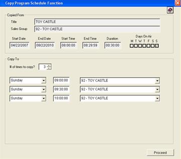 The following screen appears. Enter in the number of times that it needs to be copied; select the days of the week that it will air on from the drop down box (can be copied up to seven times). Enter in the start time. Depending upon how many episodes have been entered into Corporate Acquisitions, there will be a selection from the drop down box. Click on Proceed to continue