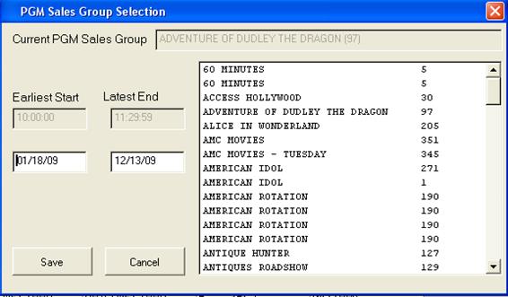 A program can be booked from 8-11pm and can contain a series of programs, or can be a one hour program. Click on the “Add New” button. Enter in the description of the Sales Group, the start and end dates, and the days of the week that it will air on. Next, click on the “Add” button to select the list of programs that will air within the Sales Group. This is linked to the scheduling module. Click Ok when complete. The new Sales Group will be added to the list