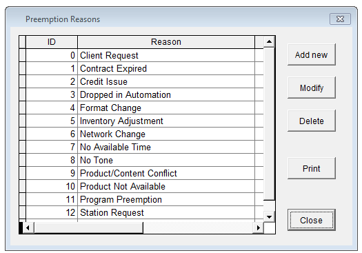 When pre-empting a spot, the system forces the user to choose a reason as to why the spot is being pre-empted. There is a set of pre-defined options that can be selected from the drop down, or if desired they can be entered here – under File, Definitions, Preemption Reasons. To add a new definition, click on the Add New button.