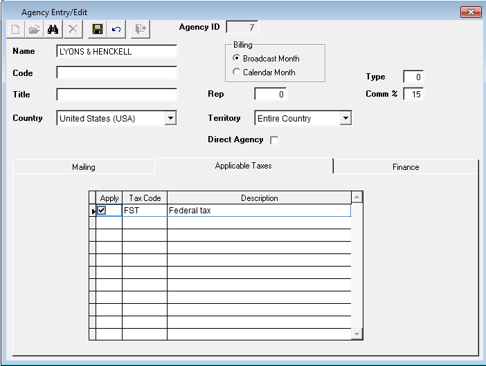 To associate the tax to an agency or advertiser, you must open up the Advertiser Add/Edit or Agency Add/Edit screens and click on the applicable taxes tab. Place a check mark under the “Apply” column