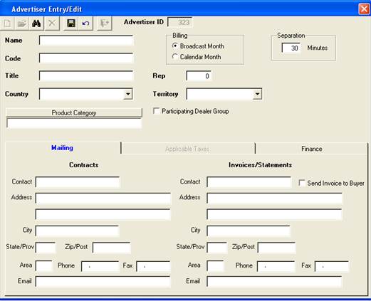 Click on File then Advertiser, and select Entry/Edit. Click on the “New” icon – the system will automatically generate a new Advertiser number; click Ok.