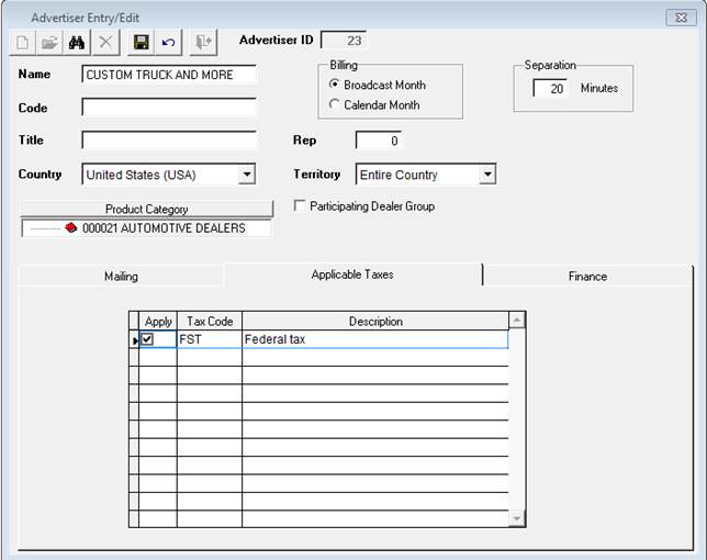 Applicable Taxes tab – if there are taxes setup for each station, the definition will appear in this screen. If the particular advertiser selected does not need to have taxes, simply un-check mark it