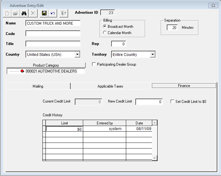 Finance tab – this is where a credit limit can be set. By entering in an amount into the New Credit Limit field, this advertiser will not be able to book any more than what is defined.