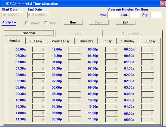 The Commercial Time Allocation screen holds the commercial time allotted per half hour for National, Local and Programming Advertising time. These values are used in the absence of Cue Sheet information.