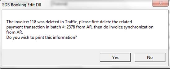Clicking Yes will show the following message. As stated, you must first delete the payments through the AR module and then synchronize the invoices with Traffic. You may print a record of this deletion.