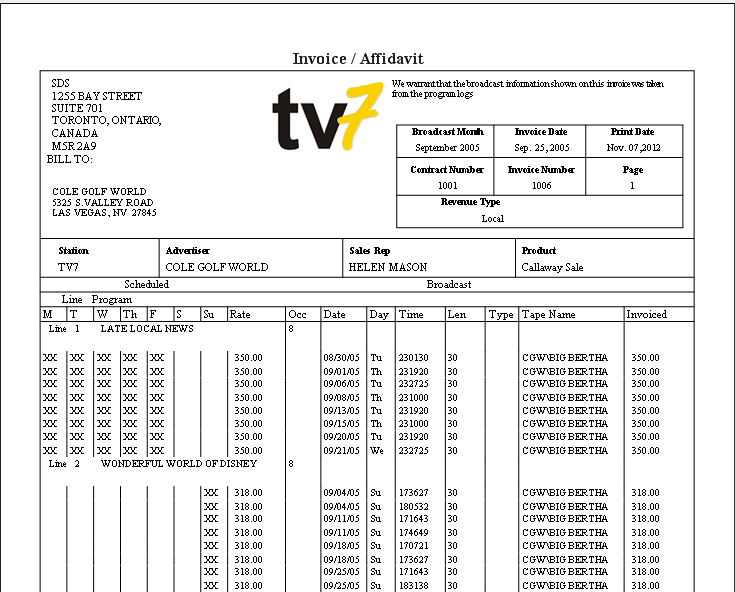 Invoice Option #2 – shows the Tape Name, date, length, sales group/rotation name, time the spot(s) ran, amount of spots, rate, and total
