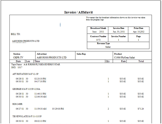 Invoice Option #3 – shows the Tape Name, the sales group/rotation name, the date, length and where each spot ran on a separate line, amount of spots, rate, and total