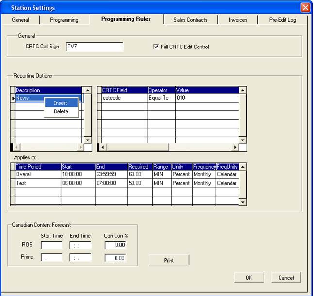 Value – click on the value field, this will bring up the Legend relating to the CRTC Field, enter the Condition of Licensing by either typing it in the field or double-clicking from the Legend list. The values entered are based on the Conditions of License that each Canadian station has. For example, 60% of the broadcast day of all Canadian TV stations must consist of "Canadian programs" as defined in the regulations.