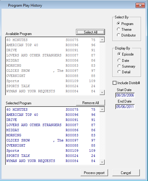 This report displays the play count information for all scheduled programs and episodes based on the selected time frame. It will also display the remaining plays available for scheduled programs as well as summarizes the total plays already used. Click on Programming, Program Reports, and select Program Play History. The following screen will appear. To choose all programs, click on the “Select All” button. Choose one of the options on the right hand side of the screen – select by Program, Theme, or Distributor. Display by Episode, Date, Summary or Detail. Choose the start/end dates and then click on “Process Report.” Note – if all programs are selected, it may take a few moments to generate