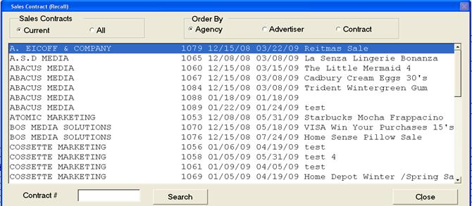 To select a contract, double click on the contract you wish to view. A keyword search can be done by typing the first few letters of the agency/advertiser name
