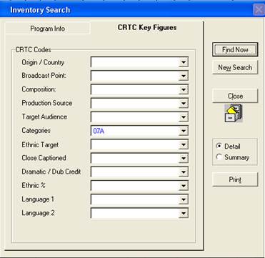 CRTC Key Figures – searches based on CRTC Key figures criteria. Select a code from one of the drop downs. In the example below, the category code 07A (ongoing dramatic series) is selected.