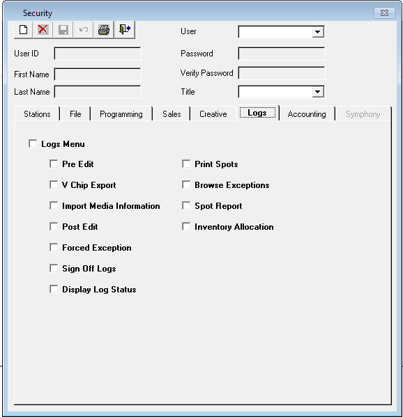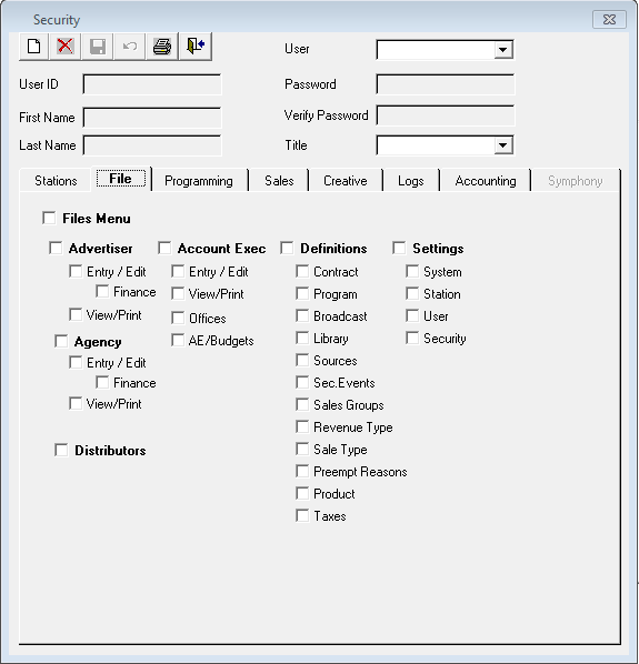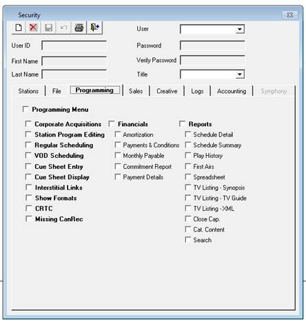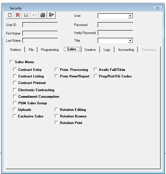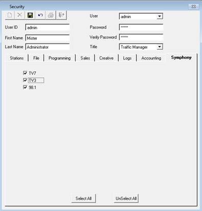 There are eight tabs in Security, one for each menu in the Traffic system and a tab for access to SDS Symphony. Select the menus for which the user will have access to. Note, that only a user set up as a Traffic Manager and Assistant Traffic Manager will have access to the Symphony tab.