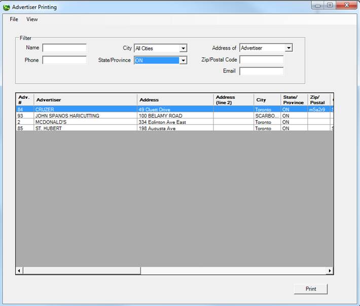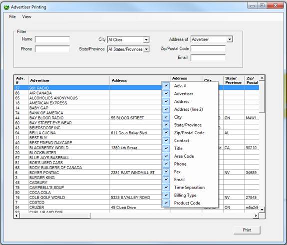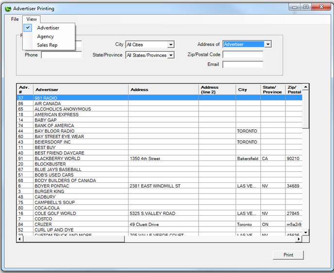 To view and/or print a list of advertisers, click on File, Advertiser, and select View/Print. The following screen will appear