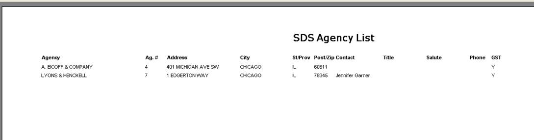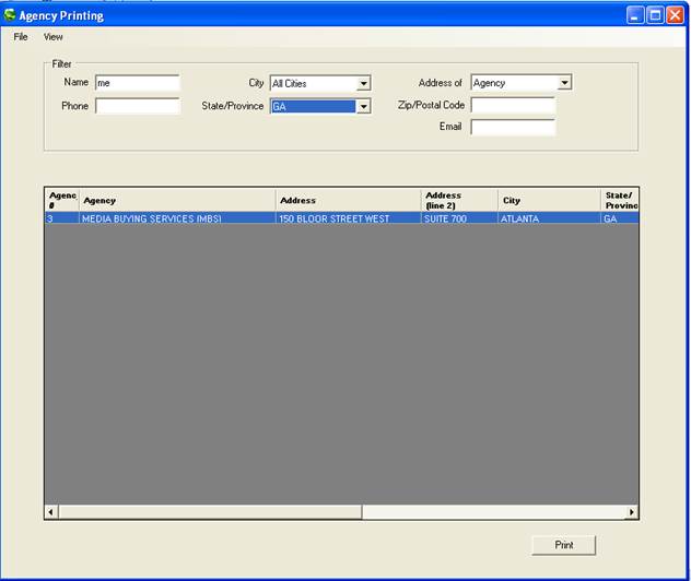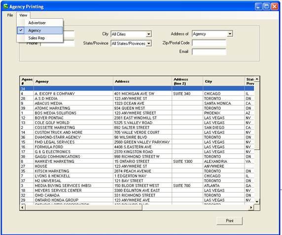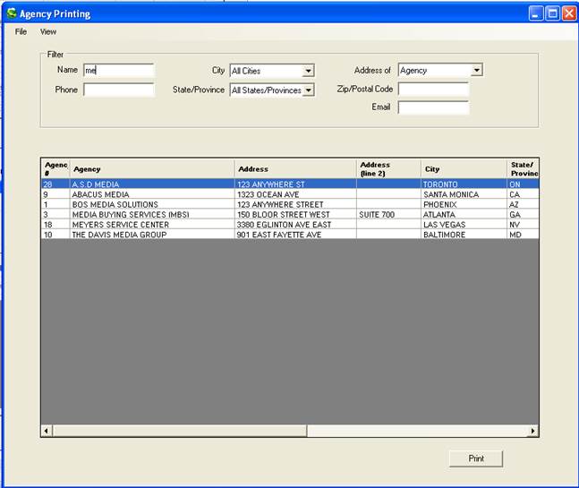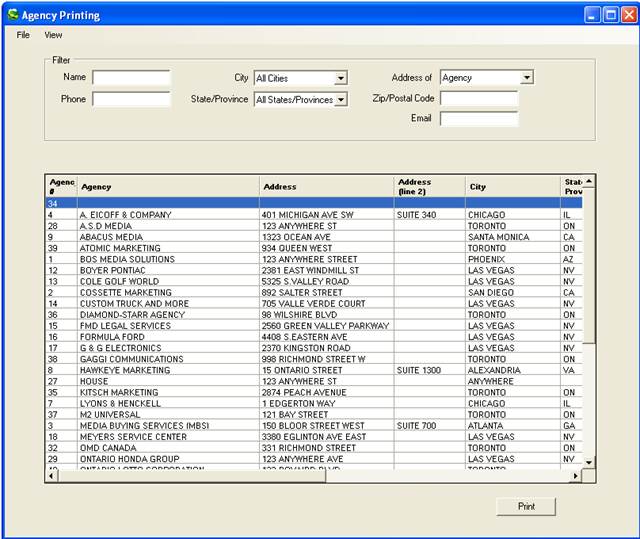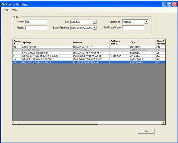 To view and/or print a list of agencies, click on File, Agency, and select View/Print. The following screen will appear