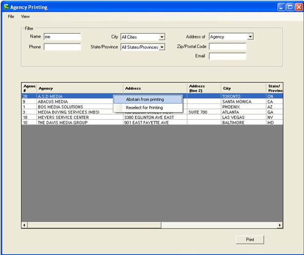 There is also the option to unselect each item by right clicking on the agency line and selecting either Abstain from Printing or Reselect for Printing